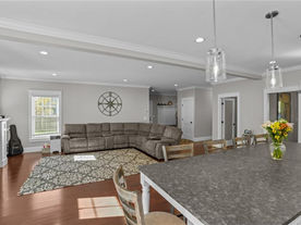 The main level features 9’ ceilings and an open-concept design centered around an L-shaped chef’s kitchen with a 10' island, complemented by a butler’s pantry with wall oven and built-in microwave.